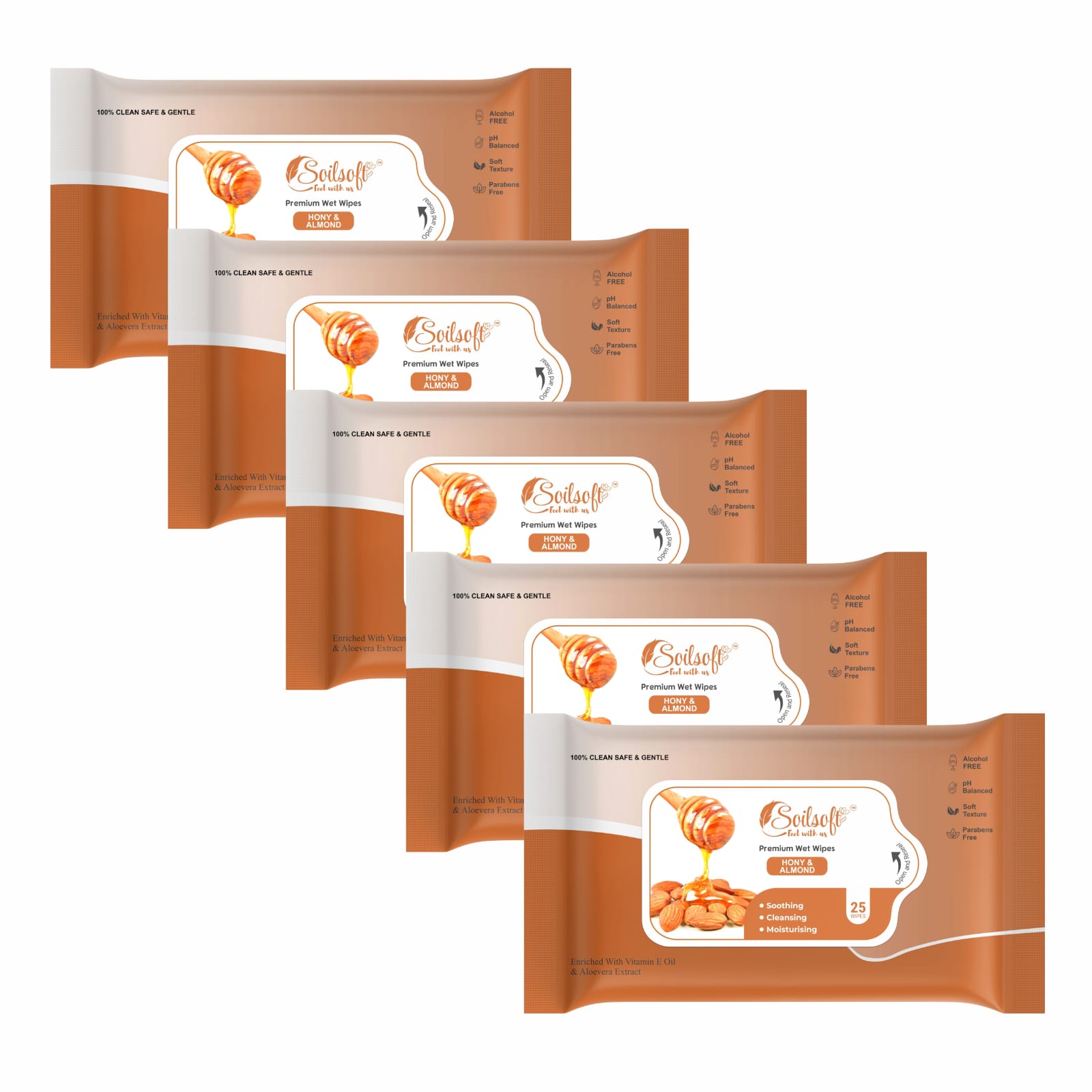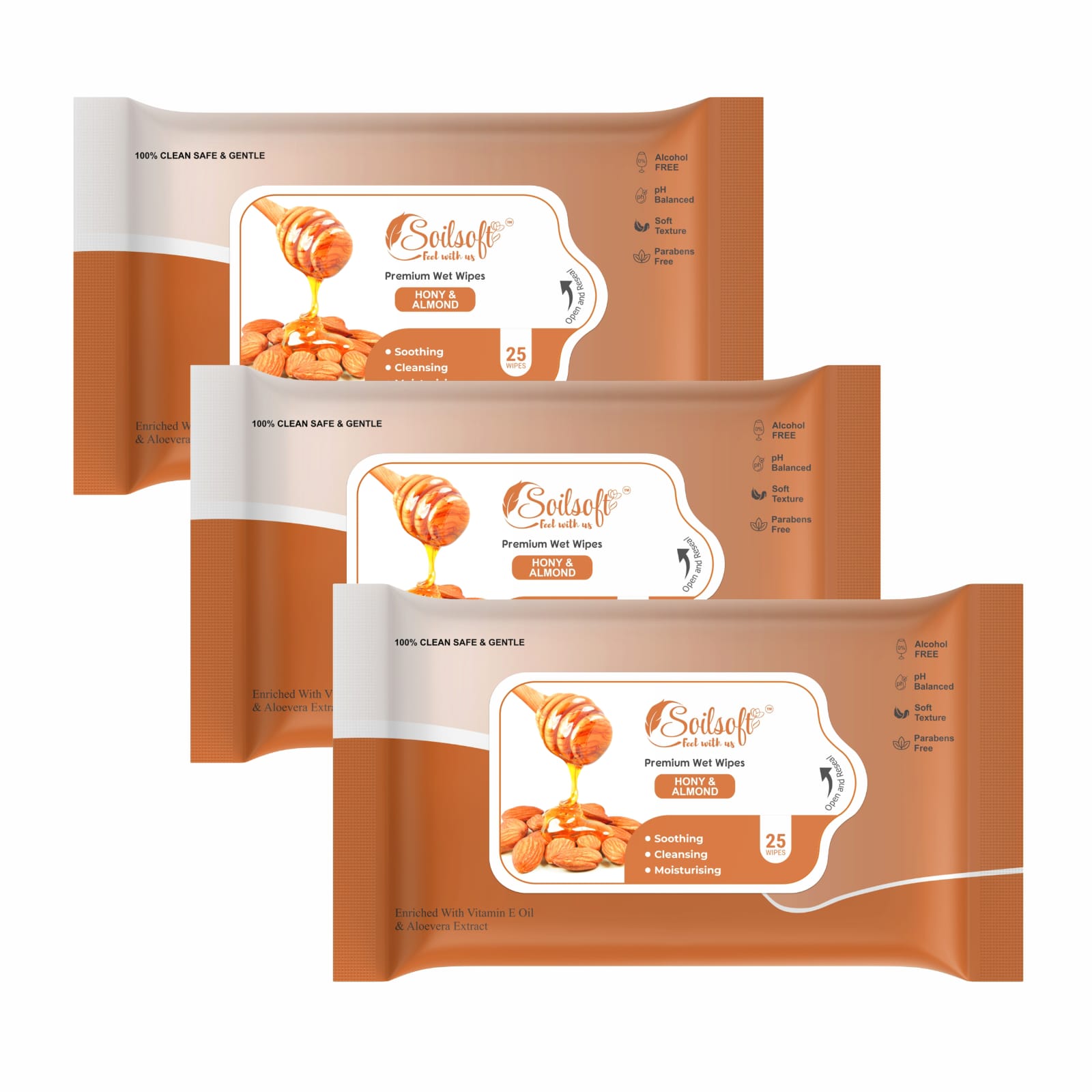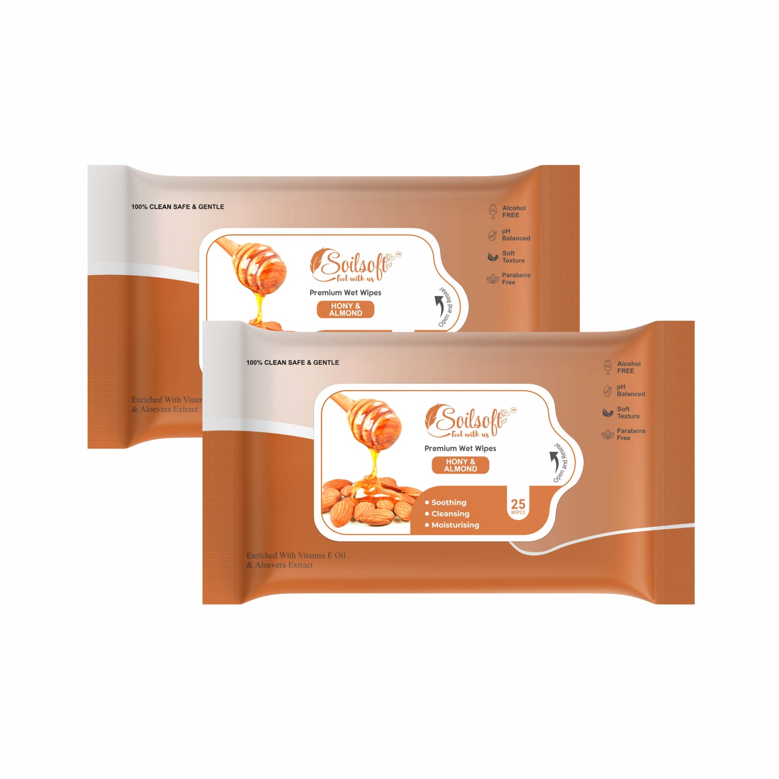Enriched with Vitamin E oil and Aloe Vera extract, these wipes deeply moisturise and help maintain the skin’s natural balance. Alcohol-free, paraben-free, and pH balanced, they are safe for all skin types, including sensitive skin. Ideal for everyday hygiene, travel, or on-the-go freshness, Soilsoft Honey & Almond Premium Wet Wipes deliver care, comfort, and long-lasting softness anytime, anywhere.